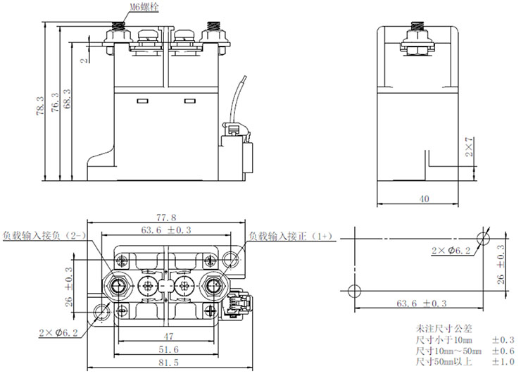 1、產(chǎn)品主觸頭按接線柱旁邊標(biāo)示“1+”的連接負(fù)載“+”端,接線柱旁邊的標(biāo)示“2-”的連接負(fù)載 “-”端