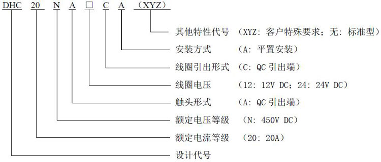陶瓷密封系列高壓直流接觸器DHC20產(chǎn)品型號(hào)釋義
