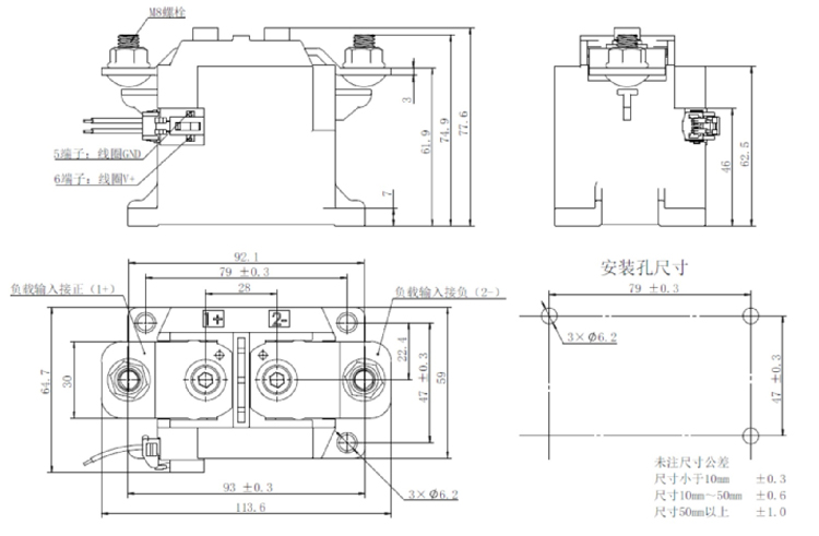 7、為防止出現松動,接觸器安裝時請正確使用墊圈。接觸器安裝處請使用M6螺釘,螺釘鎖緊扭 矩請控制在3N.m~4N.m;負載端的M8安裝螺母鎖緊扭矩請控制在9N.m~11N.m。在扭矩超過范圍 的情況下,產品可能遭到破損。
